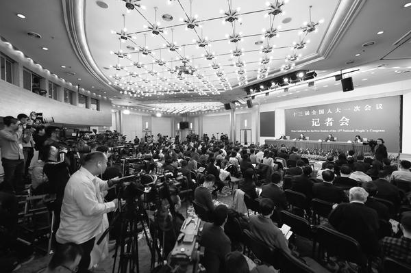 3月7日,十三届全国人大一次会议新闻中心举行记者会,邀请农业部部长韩长赋,农业部新闻发言人、办公厅主任潘显政就“实施乡村振兴战略 推动农业转型升级”相关问题回答中外记者的提问。新华社记者 李鑫 摄
