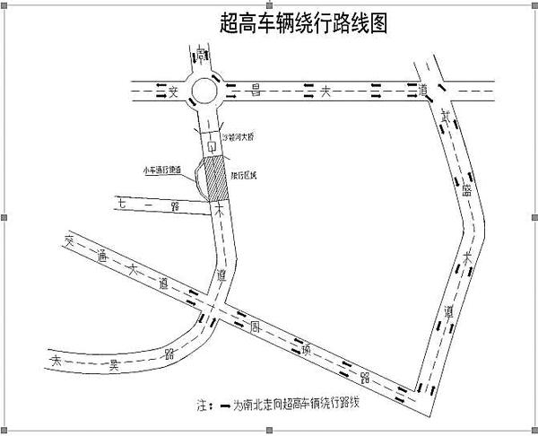 二、车辆绕行路线:大中型货车、客车(3米以上含3米)向南方向行驶的车辆,请绕行文昌大道、武盛大道;向北方向行驶的车俩,请绕行周项路、武盛大道。