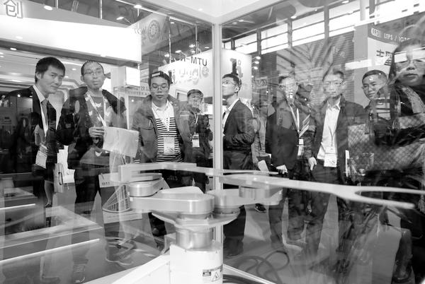 3月14日,参观者在展会现场观看一台无尘搬运机器人进行作业演示。