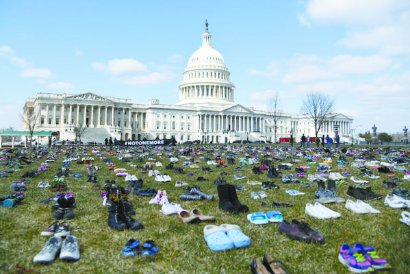 3月13日,在美国首都华盛顿,国会山前的草坪上摆放着代表枪击事件中遇难儿童的鞋子。 当日,7000双代表自2012年美国康涅狄格州桑迪胡克小学枪击案以来枪击事件中遇难儿童的鞋子摆放在华盛顿国会山前的草坪上。人们以这种无声的方式,抗议国会面对枪击频发现状的不作为,呼吁枪支改革以保障美国儿童的安全。 新华社发
