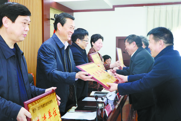 会议对我市2017年度教育工作先进单位、先进科室进行了表彰(如图)。扶沟县、商水县、开发区教体局负责人进行了典型发言。
