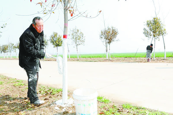丁集镇以打造精品路线、重点区域为植树工作重点,全面掀起春季植树造林高潮。图为3月12日,工人正在对新栽树木进行养护。 杨光林 王洁石 摄