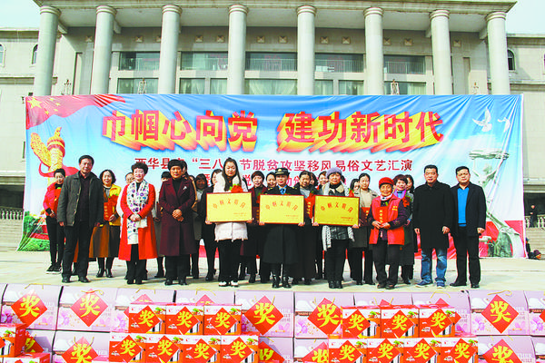 3月5日,西华县在女娲广场举行庆“三八”节脱贫攻坚、移风易俗文艺汇演暨巾帼脱贫行动颁奖活动,对26位“创业创新女性”、26位“巾帼扶贫之星”、6位“巾帼维权卫士”、6位“巾帼扶贫爱心大使”及3个“巾帼文明岗”进行表彰。图为颁奖现场。