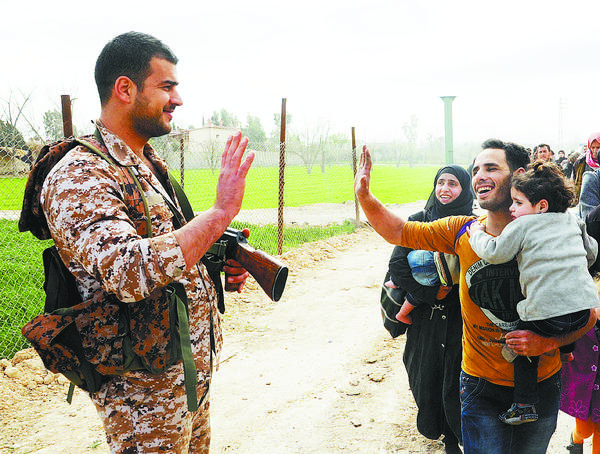 3月15日,在叙利亚大马士革东郊,一名平民在撤离途中和政府军士兵打招呼。当日,叙利亚政府军在首都大马士革东郊东古塔地区收复一处要地,当地数千被困平民撤离。这是自2月底东古塔地区为平民撤离开辟人道主义通道以来最大规模的平民撤离。新华社发