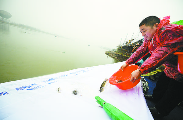 3月18日,扬中市园博园长江段,市民将河豚苗放归长江。当日,2018年中国扬中长江渔业资源增殖放流活动在江苏省扬中市园博园长江段举行,30余万尾河豚、鳙鱼等鱼苗被放归母亲河新华社发