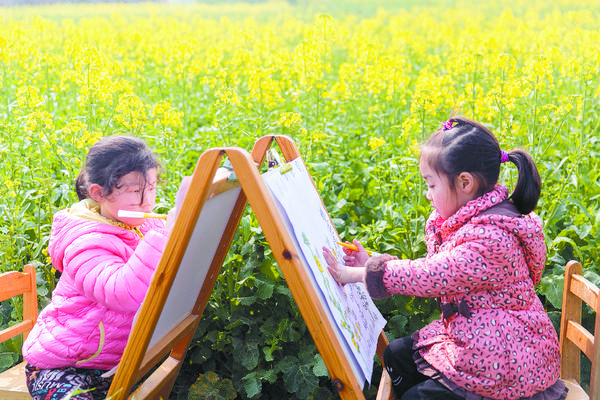 3月23日,江苏省如皋市一家幼儿园的小朋友在油菜花田间画画。当日,江苏如皋一家幼儿园的老师带着小朋友来到油菜花田,指导小朋友用画笔描绘美丽春色,感受春天的气息。新华社发