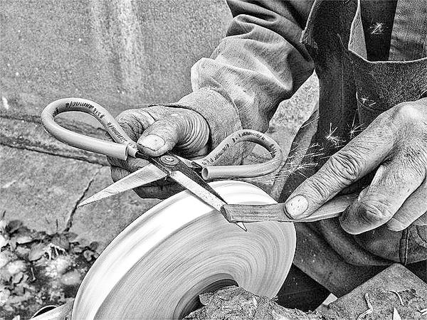 你千万不要小看这“磨剪子、抢菜刀”,千万不要以为它技术含量低,其实,里面的学问大着哩!先说说抢菜刀吧。王善良说,作为一个磨刀人,一定要把心放平,不能只图挣钱而不顾质量,甚至损害顾客的利益。王善良磨刀时,首先是看刀刃薄厚,如果刀刃较薄、较快,就不必动用抢刀或砂轮,而是直接在磨石上磨;如果刀刃很厚、很钝,再看刀口钢是硬或是软。王善良很有经验,只要用手指在刀刃侧面上轻轻一弹,就能从响声中听出,刀口钢是硬或是软。硬的就用砂轮打,软的就用抢刀抢,然后再用磨石磨。磨刀时,用力要均匀,磨刀要细心,这样磨出的刀才耐用。王善良很善良,对刀口钢软的,绝对不用砂轮打。因为,如果用砂轮一打,刀刃遇热退火,就会减弱钢性,就会缩短刀的寿命,甚至会将一把好刀打报废。但是,有的磨刀人,为了省时、省力、速度快,明知刀口钢软,还用砂轮打,对刀造成伤害。其实,很多人是不明白这个道理的,他们只知道有的刀磨后,反而不好使了,却不知道为什么。再说说磨剪子吧。磨剪子的时候,不但要掌握好角度——角度不能忽大忽小,还要掌握好力度——力度也不能忽大忽小。磨剪子,既要磨好剪子刃,还要调好剪子轴,不然,剪子磨得再快,也不好使。调剪子轴比磨剪子难得多。尤其那些使用时间很长的老剪子,剪子轴磨细了,剪子口磨松了,在调剪子轴时,如果技术夹生,很容易把轴砸弯,或者调不过来。常言说,熟能生巧,只要细心慢慢摸索,就能摸索出经验来。怎么能说“磨剪子、抢菜刀”不是个技术活哩!