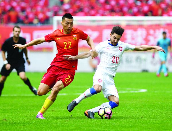 3月26日,中国队球员于大宝(左)在比赛中拼抢。当日,在广西体育中心举行的2018中国杯国际足球锦标赛季军争夺战中,中国队以1比4不敌捷克队。