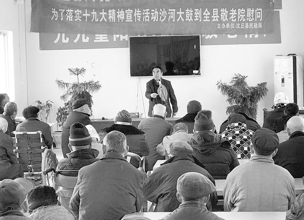 近日,沈丘县非物质文化遗产沙河大鼓传承人王振山,携带他专门为宣传党的十九大精神而创作的作品《唱响新时代——十九大精神放光芒》,来到该县冯营乡敬老院为孤寡老人演出。据了解,沈丘县为了深入宣传学习贯彻党的十九大精神,充分发挥基层文艺骨干的作用,深入社区、村庄、学校、企业等地,开展多种形式的文艺演出,让党的十九大精神深入人心、落地生根。让更多基层群众在欢声笑语中领会党的十九大精神。