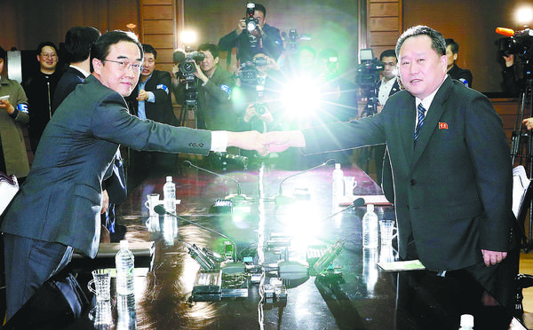 3月29日,在板门店朝方一侧的统一阁,韩国统一部长官赵明均(左)和朝鲜祖国和平统一委员会委员长李善权在会谈后握手。韩国和朝鲜代表29日在板门店朝方一侧的统一阁举行高级别会谈,双方商定于4月27日在板门店韩方一侧的“和平之家”举行韩朝首脑会晤。 新华社发