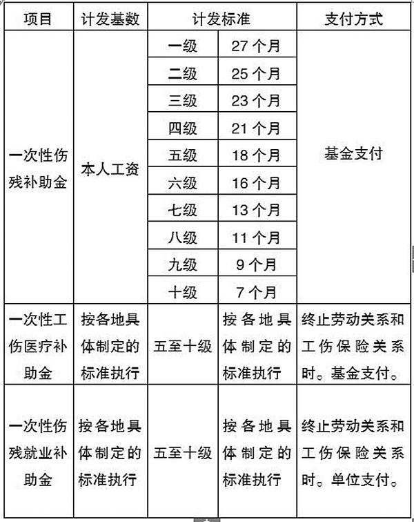 工伤医疗终结后一次性发放待遇(一至十级伤残)(详见表一)。
