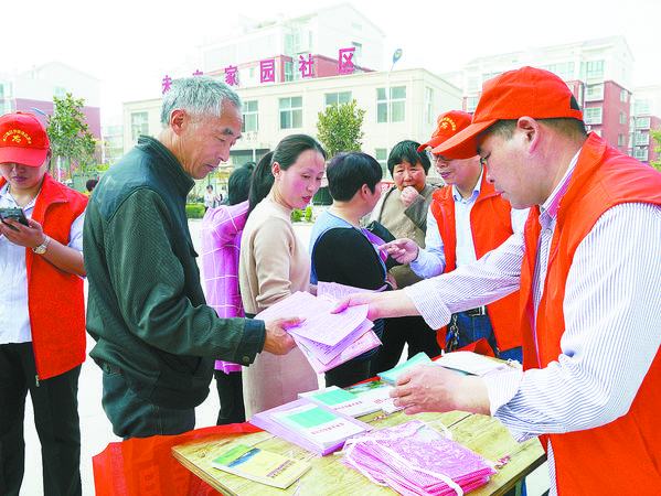 当日下午,工作人员在未来家园小区门前设置宣传台、摆放宣传横幅和展板,居民从展台前经过时,工作人员热情地上前向居民介绍政策(如图)。为引起广大居民的兴趣,工作人员还特意准备了印有宣传语的围裙,发放给前来咨询的居民。一名工作人员向小区居民介绍:“周口港区政府为辖区的每户居民都购买了家庭财产保险,居民财产在家中或小区里遭遇盗窃、抢劫或房屋因自然灾害、火灾等造成的财产损失,由保险公司给予赔偿。”随后,工作人员向居民详细介绍了保险项目以及赔付金额。