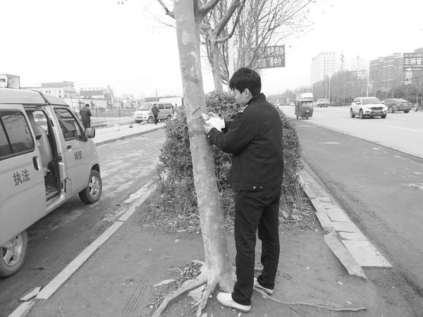近段时间以来,我市城管部门积极开展市容环境综合整治,为市民营造一个干净整洁的城市环境。右图为城管队员向商户宣传“门前三包”政策。下图为城管队员清理行道树上的小广告。 记者 李一 摄