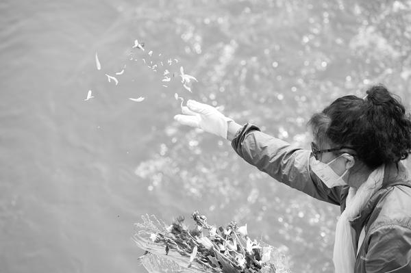 4月2日,一位逝者家属将鲜花撒入大海,寄托哀思。当日,2018年北京市骨灰撒海启航仪式暨年度首次骨灰撒海活动在天津滨海新区国际邮轮母港附近海域举行,共有60余位逝者的骨灰被撒入渤海。 新华社发