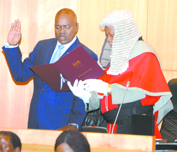 4月1日,在博茨瓦纳首都哈博罗内,马西西(左)宣誓就职。 博茨瓦纳执政党民主党现任主席莫克维齐·马西西4月1日在首都哈博罗内市议会大厦接任总统职务,将行使总统权力至2019年10月全国大选。新华社发