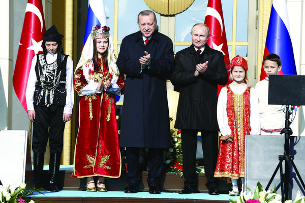 4月3日,在土耳其首都安卡拉,土耳其总统埃尔多安(左三)和到访的俄罗斯总统普京(右三)以视频连线方式出席阿库尤核电站开工典礼。土耳其与俄罗斯合作建设的土首座核电站3日破土动工。土耳其总统埃尔多安和到访的俄罗斯总统普京在安卡拉以视频连线方式出席开工典礼。 新华社发