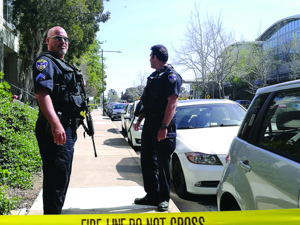 4月3日,在美国加利福尼亚州圣布鲁诺市,警察在优兔公司总部附近执勤。美国优兔公司位于加利福尼亚州圣布鲁诺的总部3日发生枪击事件,目前伤亡情况不详。新华社发