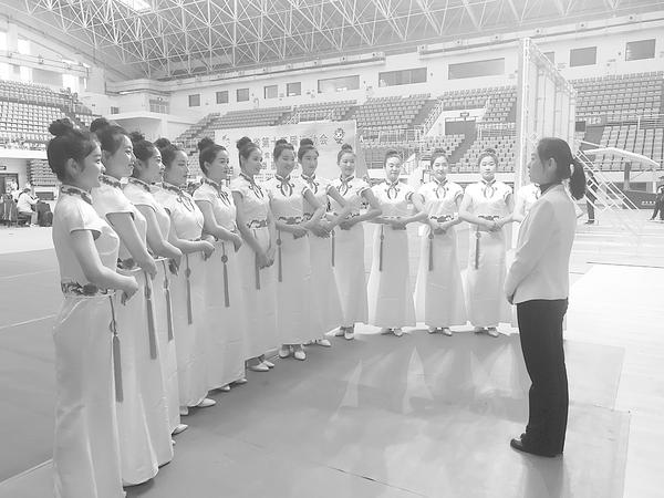 省运会志愿者工作部工作人员向礼仪志愿者安排注意事项。