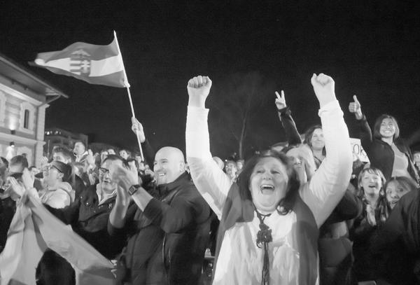 4月8日,在匈牙利首都布达佩斯,匈牙利总理欧尔班的支持者庆祝匈牙利执政联盟(青民盟和基民党)在国会选举中获胜。根据匈牙利国家选举办公室8日晚公布的初步计票结果,匈牙利执政联盟(青民盟和基民党)在当天举行的国会选举中获得压倒性胜利。 新华社发