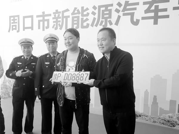 4月10日上午10时,我市新能源汽车专用号牌发放仪式启动。在启动仪式上,新能源汽车车主张磊领到“豫PD08887”专用号牌。据了解,这是我市发放的首个新能源汽车号牌。记者 姬慧洋 摄