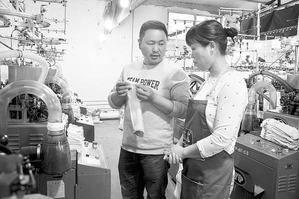 商水县谭庄镇三李村青年农民李自业,2002年外出打工学得制袜技术,2012年返乡创业在村里办起制袜厂。目前年生产袜子1200多万双,年产值800多万元,安排本村留守妇女近百人就业,帮助她们脱贫致富奔小康。左图为李自业在车间指导生产。