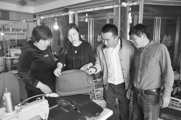 4月18日,商水县张明乡沟西村驻村第一书记任将伟(右二)和技术人员在检查成品箱包质量。去年以来,商水县500多名驻村第一书记积极开展产业扶贫,充分利用劳动力资源丰富的优势,引进资金和技术,在村头办起包箱制造、袜业纺织、渔网编织等各类扶贫企业100多个,帮助村民脱贫致富奔小康。记者 付永奇 摄
