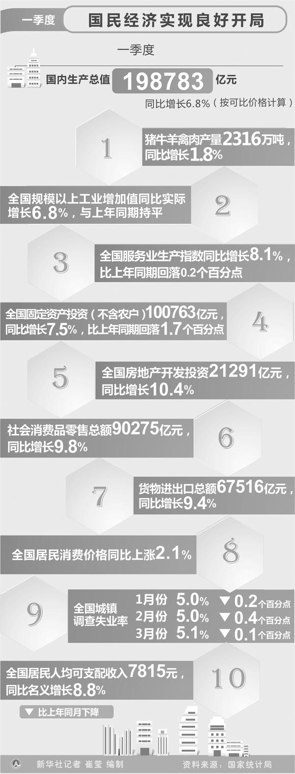 首季6.8%的经济增速更显稳健,5%左右的城镇调查失业率表明就业稳步扩大,2.1%的居民消费价格涨幅显示物价稳定、市场供应充足……