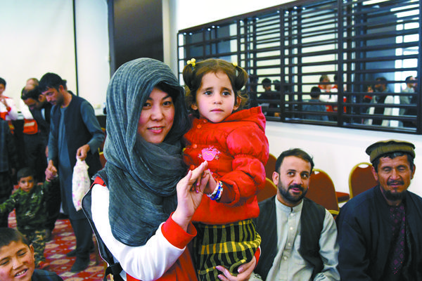 4月17日,在阿富汗首都喀布尔,中国红十字援外医疗队成员在记者会后与患儿合影。中国红十字援外医疗队17日在阿富汗首都喀布尔表示,根据“天使之旅——‘一带一路’大病患儿人道救助计划”,第二批阿富汗25名先天性心脏病患儿将赴华接受治疗。