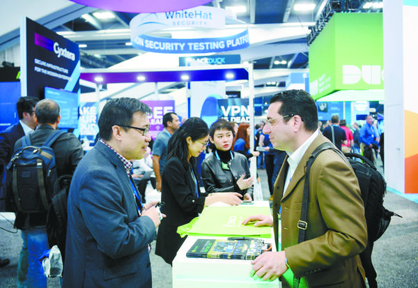 4月17日,在美国旧金山举行的2018年全球信息安全产业RSA大会上,与会者(右)在360企业安全集团展台咨询。 2018年全球信息安全产业RSA大会16日在美国旧金山市开幕。RSA大会被视为全球信息安全领域的风向标,今年大会的主题是“现在很重要”,共吸引了约500家世界各地的信息安全产品供应商和4万多名业界人士参会。新华社发