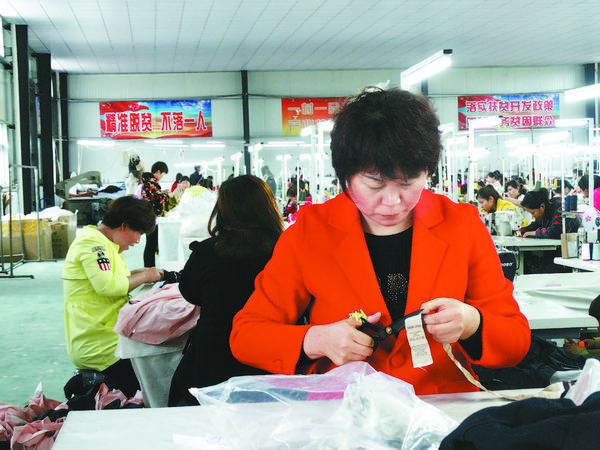 4月22日,在沈丘县付井镇的一个“扶贫车间”里,工人们正在紧张加工订单服装。近年来,针对贫困户家庭增收途径缺乏这一难题,付井镇积极创新扶贫方式,采取多种举措,鼓励企业把“扶贫车间”办到群众家门口,有效加快了贫困户的脱贫步伐。谢辛凌 徐然 摄