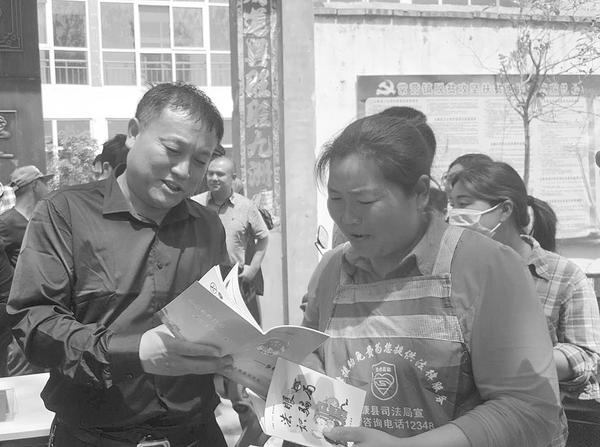 4月22日,太康县司法局联合周口市发改委工作人员到太康县常营镇五子王行政村,宣传法律知识,讲解扶贫政策。他们向群众发放普法宣传围裙600余件,赠送法律类书籍1200余册,为150余名群众提供了法律咨询服务。图为活动现场。 记者 马治卫 通讯员 青俊 摄