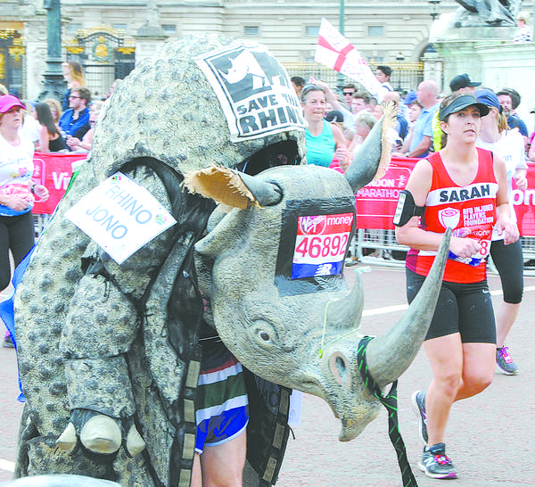 4月22日,第38届伦敦马拉松赛遭遇高温,但仍然吸引了四万多人参赛,创造历史新高。一般参赛者轻装简从跑完比赛已经不易,但很多参赛者身穿特色服装甚至背负沉重的道具参赛,大大增加了比赛的难度。这是4月22日在距离终点200米的地方拍摄的参赛者。新华社发