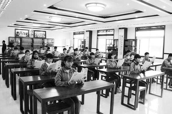 “子曰:父母在,不远游……”在琅琅的读书声、悠扬悦耳的琴声中,记者一行不知不觉来到了文昌书院。书院的走廊上挂满了书法名家和文昌中学师生的书法作品,浓郁墨香扑面而来。国学堂、学而堂、读经馆、乐教坊、书画苑等私塾式学堂给人一种典雅复古的感觉。学生在老师的带领下朗读《论语》。朗读一段后,老师会讲解本段内容的意思。记者注意到,与普通教室不同,这里的书桌上没有堆积如山的教辅资料,学生人手一本《论语》。文昌书院安排有书法、绘画、抚琴等课程,传承中华优秀传统文化。