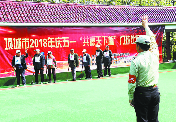 4月24日,项城市庆五一“共赢天下杯”门球比赛在该市人民公园开幕。来自项城市部分局委、21个镇办的36支代表队参加比赛。 记者杨光林 摄