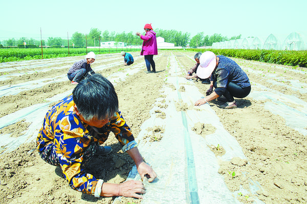 4月28日,付井镇裕禾种植专业合作社的工人正在将新生出的豆角苗从地膜中放出。据了解,该合作社占地30亩,共有大棚51个,种植了番茄、茄子、西瓜、豆角等作物,累计带动56户贫困户脱贫致富。 韦伟 摄