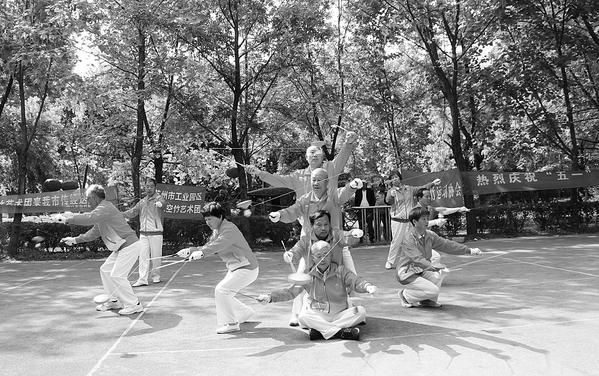 在双人、个人交流赛中,两地爱好者各亮绝活,高抛低旋、前跳后翻,尽展风采,空竹在他们手中仿佛被赋予了生命,轻巧灵动,做出各种惟妙惟肖的动作,如“大鹏展翅”“神龙摆尾” “鲤鱼翻波”“犀牛望月”“织女纺线” “鲁班拉锯” 等,令人眼花缭乱、目不暇接。