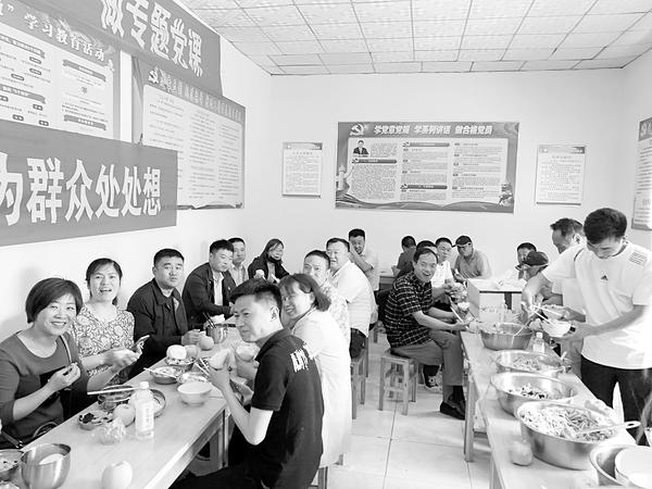 “我们驻村两年多来都是自带小灶做饭,现在坐到一块儿吃大锅饭,大家边吃边聊,不仅增进感情,还在工作上扬长补短,真解决不少问题。”郸城县教体局驻城郊乡袁武营行政村第一书记徐坤盛了两勺蒜薹肉片、两勺水煮肉片、两勺洋葱木耳、两勺凉拌黄瓜,正好堆满一碗,再拿一个馒头、一个餐后苹果,他坐在了城郊乡扶贫副书记杨培峰的身边。