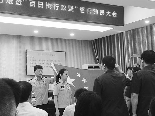 会上,川汇区法院党组成员、政治部主任邵士明宣读了《川汇区人民法院开展决胜基本解决执行难暨“百日执行攻坚”实施方案》。该院执行警务局局长和各执行组组长分别递交军令状,并作表态发言。全体执行警务局干警就决胜基本解决执行难,面向国旗庄严宣誓(如图)。