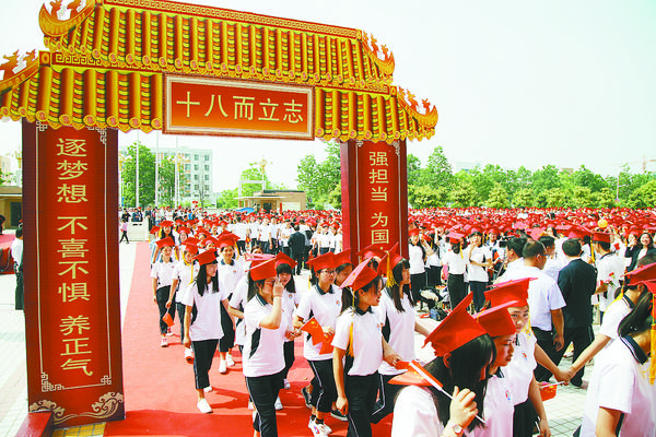 5月2日,项城市2018年“胸怀梦想,扬帆起航”中学生18岁成人仪式在项城三高举行,学生们戴上成人帽,牢记师长的嘱托,在家长的引领下,走上红地毯,穿过成人门,昂首迈出了成人之路的第一步。