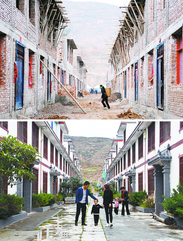 这是一张拼版照片,上图为2008年11月21日,一位村民背着背篓走过“感恩村”的在建民房;下图为2018年5月9日,感恩村村民在村中街道上行走。