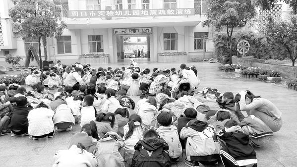 5月11日上午,周口市实验幼儿园举行了防震疏散演练。随着第一次警报响起,孩子们双手抱头就地寻找安全处避震,第二次警报响起,各班老师组织孩子们紧张、有序、快速、安全撤离教室。记者 刘华志 摄