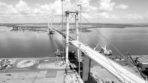 由中国路桥公司承建的中国在莫桑比克最大基建项目——马普托跨海大桥及其连接线工程预计将于2018年6月正式通车。这座总长3公里多的跨海大桥建成后,将以680米长的主跨,成为非洲主跨径最大的悬索桥,并极大便利马普托和对岸卡腾贝之间的交通。新华社发