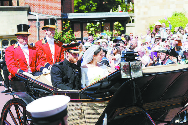 5月19日,在英国温莎的温莎城堡,英国哈里王子与妻子梅根·马克尔在婚礼仪式结束后乘坐马车进行巡游。当日,英国哈里王子与美国女演员梅根·马克尔在英国温莎城堡举行婚礼。