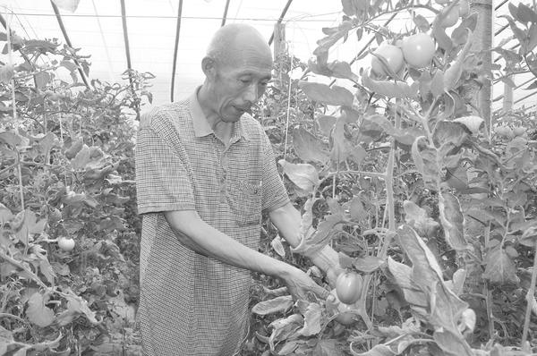 5月21日,商水县姚集镇70多岁的菜农訾守义在大棚内采摘成熟的番茄。