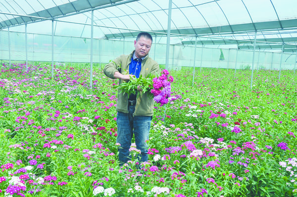 昨日,商水县平店乡万和园花卉基地技术员刘军停在大棚内采摘石竹梅。石竹梅是制作玫瑰花束的配花,市场需求大。今年该基地种植的12棚20亩石竹梅供不应求。近年来,平店乡大力实施“返乡创业、助力脱贫”工程,在昆明打工的青年刘军停、李新红等返乡后种植四季观赏花卉1000多亩、食用药用玫瑰600多亩,吸纳近百名贫困群众就业。