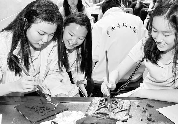 5月24日,在山东烟台王懿荣纪念馆,菲律宾华裔青少年学习制作甲骨文“福”字。