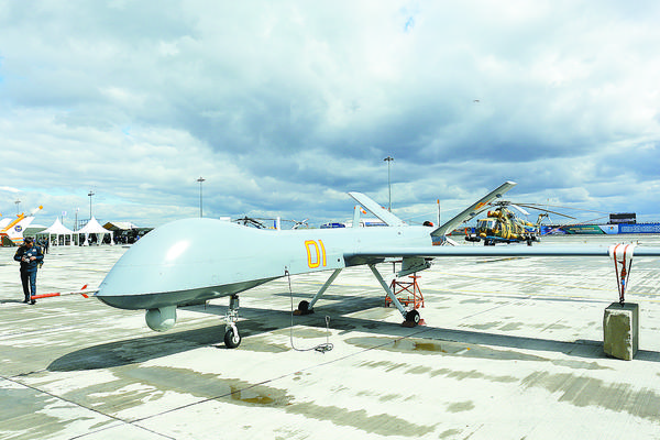 这是5月23日在哈萨克斯坦阿斯塔纳拍摄的哈萨克斯坦防务展上的中国产无人机。为期4天的第五届哈萨克斯坦防务展23日在哈首都阿斯塔纳开幕。中国国家国防科技工业局新闻宣传中心组织中国7家大型军贸公司参展,展品涵盖陆海空三军装备。 新华社发