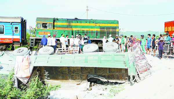 5月24日,在越南中部清化省拍摄的事故现场。5月24日凌晨,在越南中部清化省,一辆载有400名乘客的火车与一辆货车相撞,造成2名火车司机死亡,超过10人受伤。新华社发