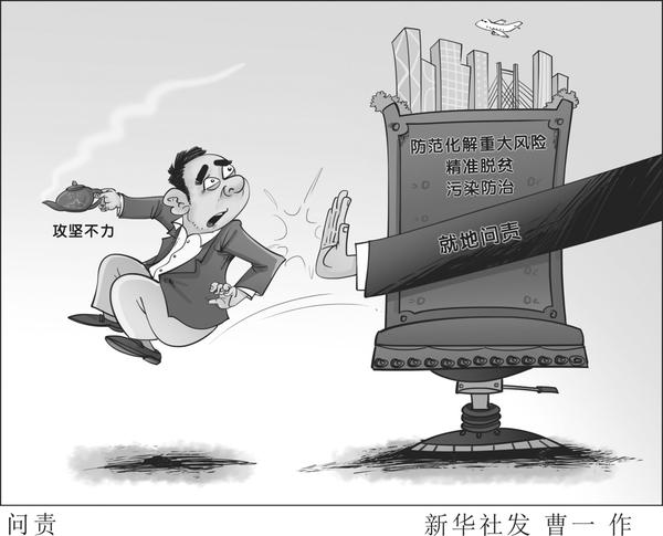 近日,内蒙古3名旗县党政正职因脱贫攻坚不力被免职,河北5名县(市区)党政领导因空气质量恶化被免职,成都、太原、西安等12个城市政府负责同志因房地产市场调控问题被约谈。将这3件事联系起来看,传递出一个鲜明的信号:在防范化解重大风险、精准脱贫、污染防治三大攻坚战一线,必须履职尽责,对攻坚不力者,就地问责。 新华社发 曹一 作