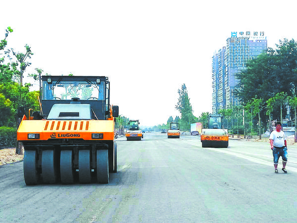 当日上午11时许,记者在施工现场看到,主路面两侧的路缘石基本铺设完毕,人行道也正在铺设中。南段水泥稳定碎石基础的铺设将要完成,压路机正把道路压平(如图 )。
